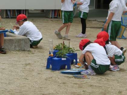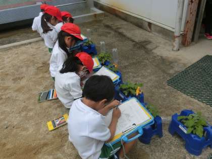 1年生が、自分たちで育てているアサガオのスケッチをしています。種から芽を出し、葉っぱが育っています。