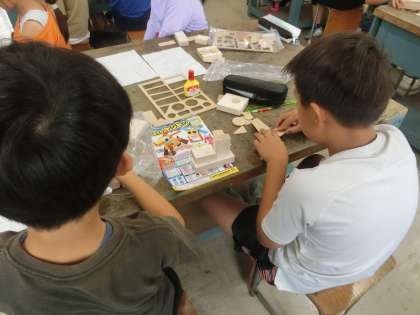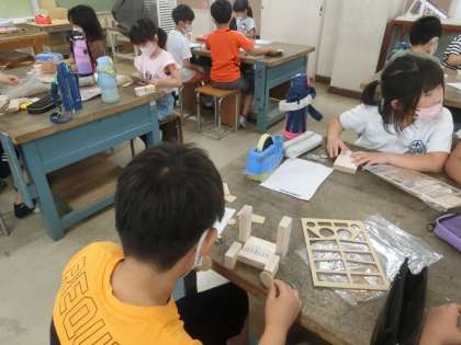 今回は、木を材料にした作品を作ります。木の接続にボンドやくぎを使い、ものづくりの技が育まれていきます。