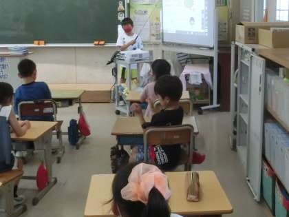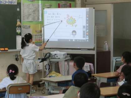 教科書の問題をプロジェクターで大きく示し、アの道とイの道の長さをくらべる方法を考えて、児童が発表をしていました。