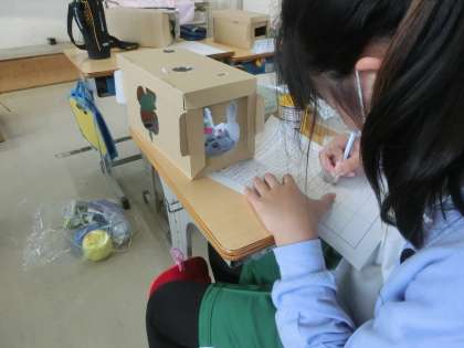 5年生の図工では、「のぞいてみると」という作品の鑑賞を行っていました。児童たちは、出来上がった作品を互いに見て回り、コメントを書いていました。