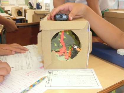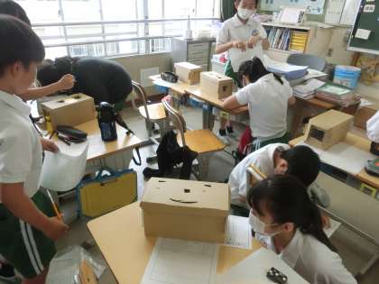 照明に当てられた箱の中をのぞくと、すてきな世界が広がっていました。鑑賞を通して、作品づくりの良い部分を学び合うことができました。