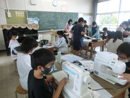 5年生の家庭科では、ミシンを使ってナップザック(ワンショルダータイプ)を作っています。