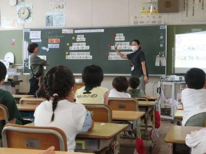 担任の先生とALTの先生がお手本を見ながら、会話の仕方を学んでいました。