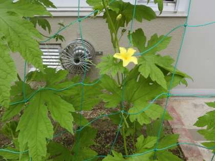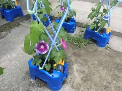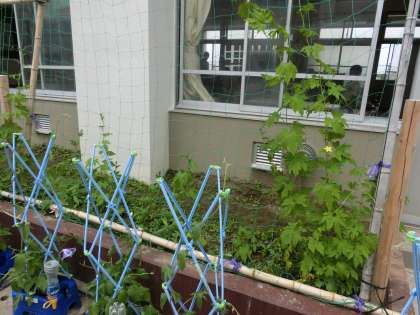 1年生が育てているアサガオと4年生が育てているツルレイシが元気につるを伸ばしています。
