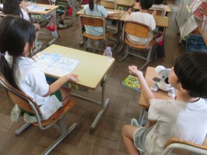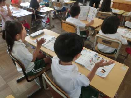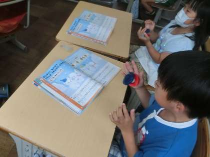 音楽の授業で、曲に合わせてリズム打ちをしています。最初は手拍子で、次はカスタネットを使って、楽しくリズムをきざんでいました。