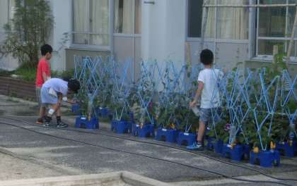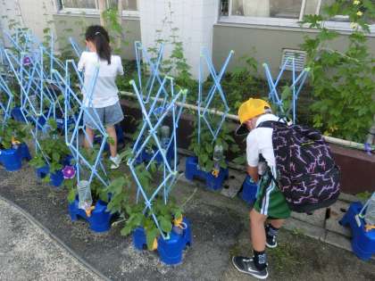 1年生が、登校後にアサガオの水やりを続けています。たくさんの花が咲いています。いくつ花が咲いたかを教えてくれる児童もいました。