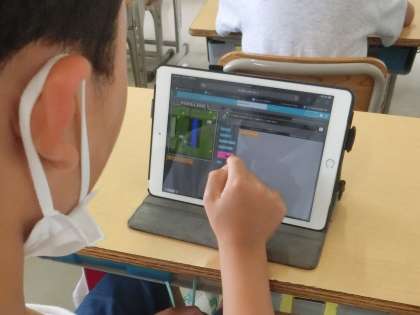 4年生と5年生が学習タブレットを使って、キャラクターを動かすプログラミングを考えています。