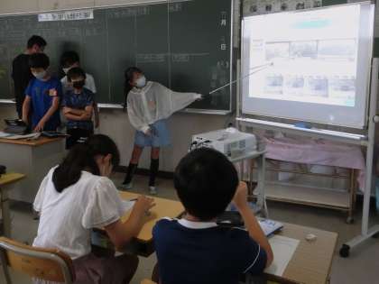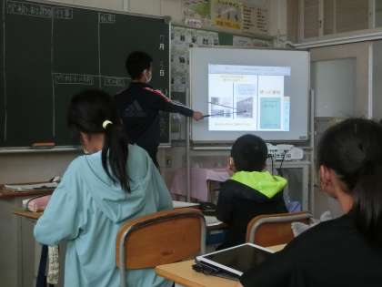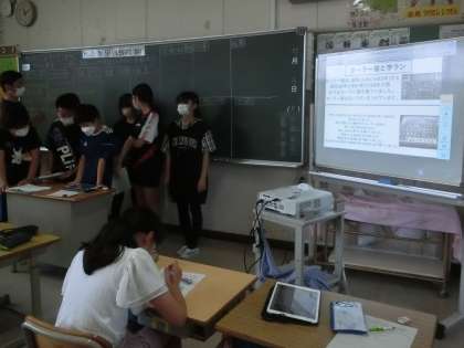 各グループが調べたことを学習用タブレットでまとめて、発表し合いました。白黒写真の資料に、歴史を感じました。