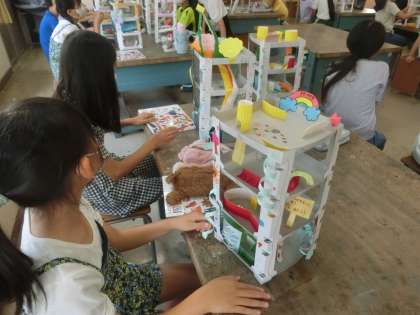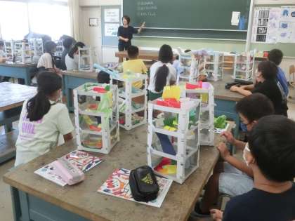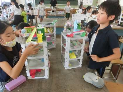工夫をこらした立体迷路を、ビー玉が転がっていきます。今回の授業では、自分の作品を紹介したり、他の人の作品を鑑賞したりして、作品のできばえをふりかえっていました。