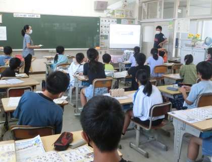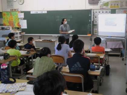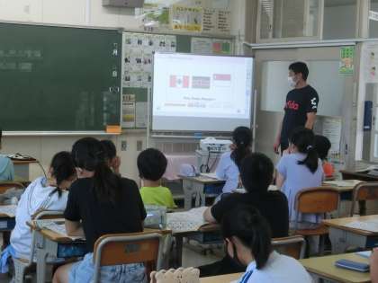 6年生の英語では、いろいろな国と有名なものについて、英語で紹介する学習していました。国旗を見て、国の名前を英語で答えたり、有名なものを英語で答えたりしていました。
