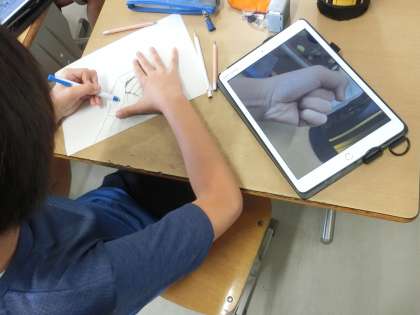 学習用タブレットで、ポーズを決めた手を撮影し、影やしわなど細かい部分までリアルに表現することを課題として、取り組んでいました。
