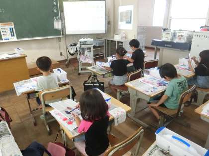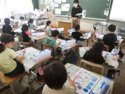 1年生の図工では、絵の具の使い方を学んでいます。