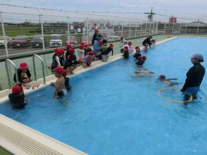 1年生の水泳学習です。今回は、プールの底にあるお宝(おはじき)探しをしています。このような活動で、水に顔をつけることに慣れていきます。