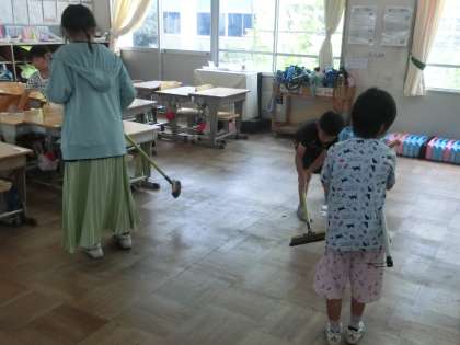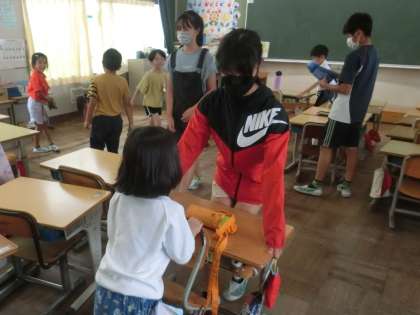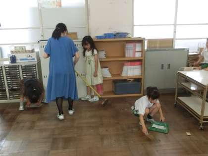 掃除の時間に1年生の教室へ行ってみると、6年生が手伝って、いっしょに掃除をしていました。自分たちが1年生のときにやってもらったことを、今度は6年生としてやってくれています。これも、縦割り活動ですね。1年生は6年生の姿をお手本に、掃除のやり方を身に付けていきます。