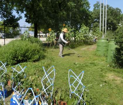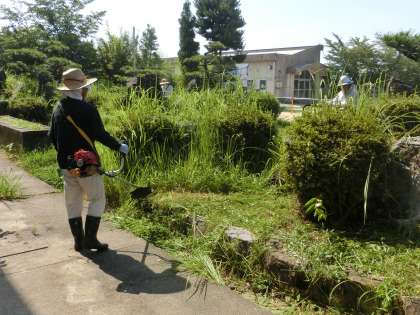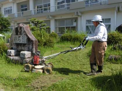 夏休み前、最後の竹ボラさんの活動日です。今回は、図工室前の畑と岩石園の草刈りをしていただきました。