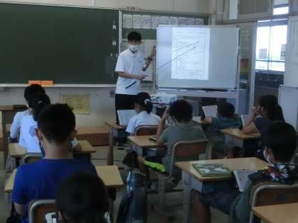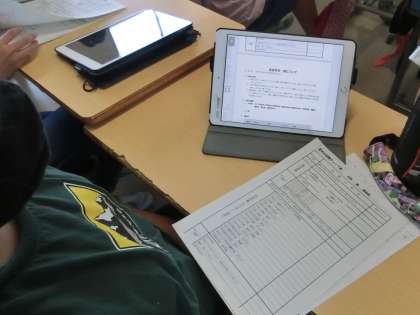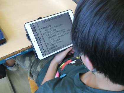 学習用タブレットに送られた資料を使って、夏休みの生活や宿題について説明をしています。夏休みは、計画を立てる力、計画を実行する力を伸ばす良いチャンスです。