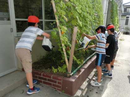 4年生が、夏休みの間に成長したツルレイシの観察を行いました。実の大きさや色などを観察していました。その後、草取りや水やりをしました。