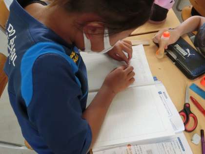 4つの角度について、四角形を4つに切って調べていました。実物を使って、分かりやすく角度の特徴を見つけることができました。