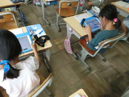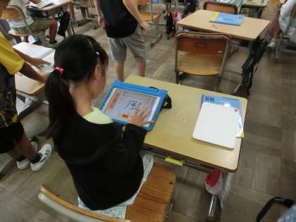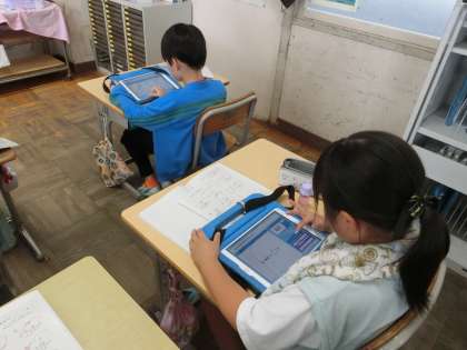 学習プリントを担任の先生に見てもらっているあいだに、待っている児童が学習用タブレットのアプリを使って復習をしています。どの問題を選ぶかも自分で決めていました。