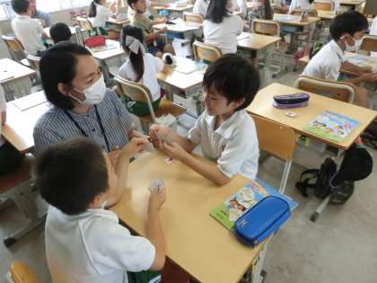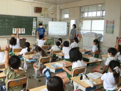 3年生の外国語活動では、ALTの先生と担任の先生の会話のお手本を見て、すきなものを英語で聞く学習を行っていました。カードを使って、会話が進むように工夫をしていました。