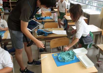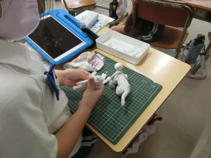 2年生の図工で、粘土を使った作品づくりです。テーマは、「夏休みの思い出」でした。作品を作る前に、思い出を発表し合って、作品のイメージをふくらませるところから始め、すてきな作品づくりができました。