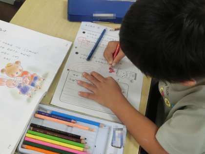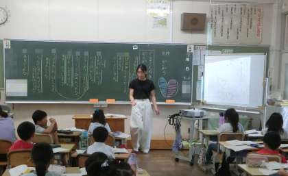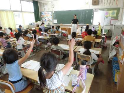 1年生の国語で、物語文の学習をしています。登場するくまさんの気持ちを考える授業です。授業の終わりには、みんなの意見で黒板がいっぱいになりました。