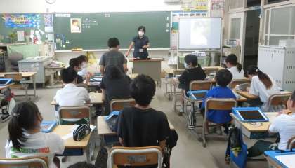 4年生の図工の授業です。ピカソの作品の楽しさを味わい、多様な表現の仕方を学んでいます。この後、学習用タブレットで描画を行いました。