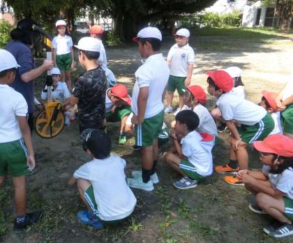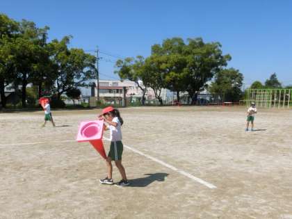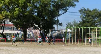 3年生の体育の授業で50m走のタイムを計測した後、運動場の周りを移動して距離を計測していました。体育と算数の長さの学習の教科横断的な授業です。予想と結果は、合っていたでしょうか?結果は、4周すると1kmを少し超えるそうです。