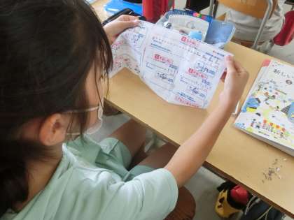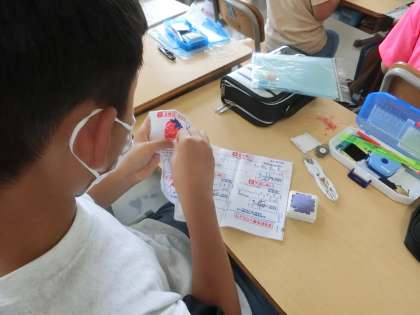 5年生の家庭科では、「針と糸を使ってできること」を学んでいます。今日の授業では、玉結び、玉止め、なみぬいの練習をしていました。