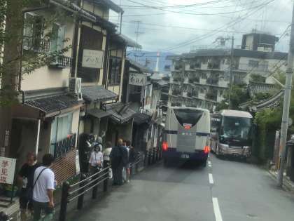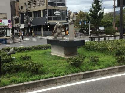 バスの車窓から。京都タワーが見えています。五条橋の牛若丸と弁慶も見えました。