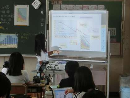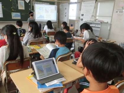 また、学習用タブレットにみんなの発表ノートが送られ、自分の考えとと比べている児童もいました。
