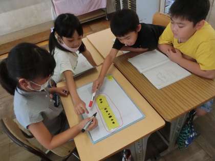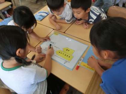 2年生の算数では、増える数の計算を考えました。グループで、話し合った考え方をみんなの前で発表しました。その後、練習問題を行い、学習の定着を図りました。
