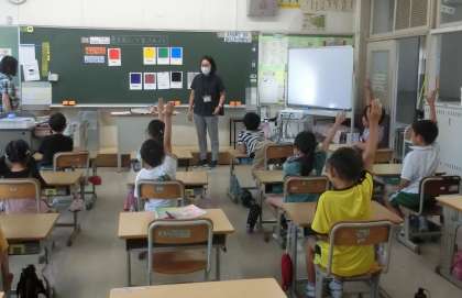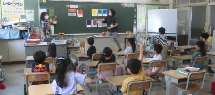 2年生の外国語活動では、色を表す英語を学んでいます。写真は、自分が知っている色の英語での言い方を発表している場面です。