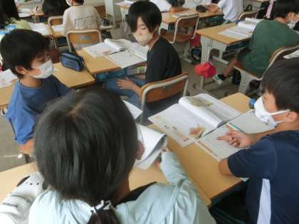 学級全体での話し合いだけでなく、多くの児童が意見を発表できるように、グループで意見交換をする場面もあります。