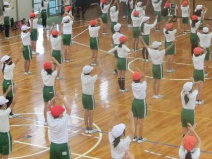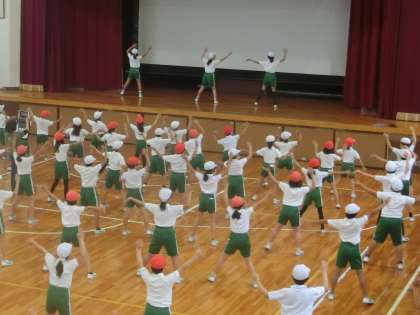 4年生は、合同体育で演技の練習をしています。動きを合わせるために、代表児童が舞台で手本を示していました。