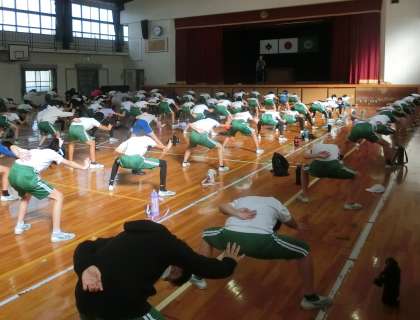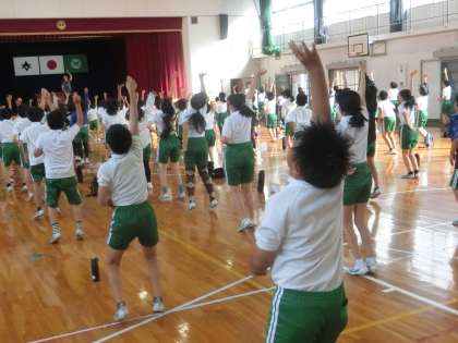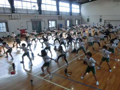 5年生が、学年体育の時間に体育館で運動場で披露する演技の学年練習をしていました。高学年の迫力のある演技を楽しみにしています。