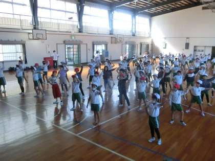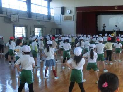 2年生が、体育館で学年体育を行いました。運動会で発表する演技の練習です。終わりの時間になっても、「まだやりたい」という声が聞こえてきました。がんばっている気持ちが伝わってきました。