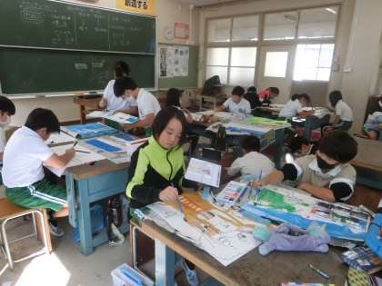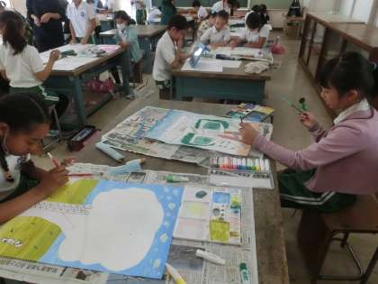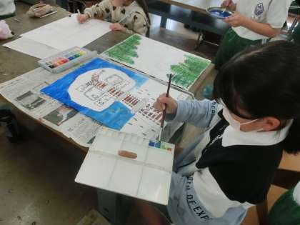 4年生の図工では、水彩画に取り組んでいます。近くにあるものと遠くにあるものの色の濃さの違いを考えたり、点描を取り入れたりしながら、大きな木をテーマにした絵を描いています。