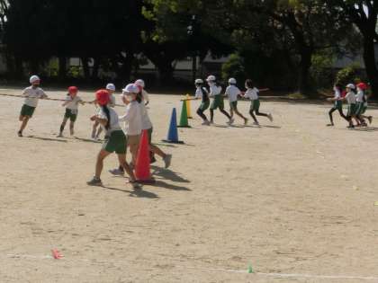 3年生、競技の練習の様子です。4人で息を合わせて走ります。
