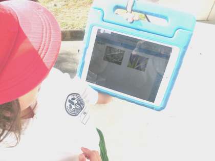 1年生が、秋の生き物を探しています。見つけた生き物を、学習用タブレットで撮影しています。春や夏にはいなかっかた生き物を見つけていました。