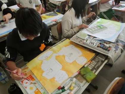 6年生が、図工の時間に読書感想画を描いています。「じいちゃんの島は宝島」という物語の印象に残った場面を描いています。