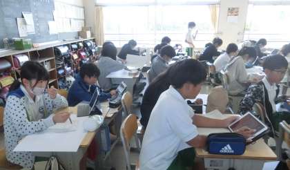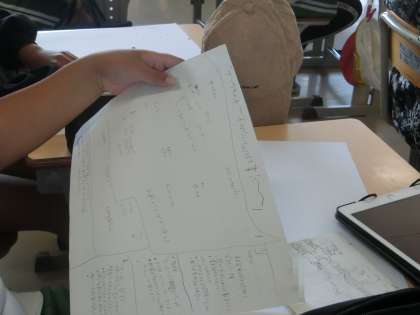 5年生の図工です。物語「ブックキャット ネコのないしょの仕事」の中で印象に残った場面をメモしたものをもとに、その中から描きたい場面のアイデアを考えています。