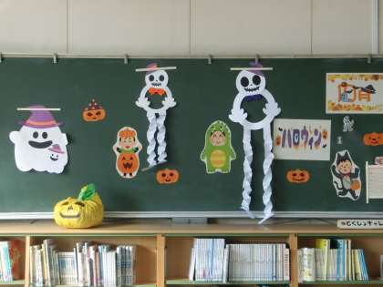 図書室に、ハロウィーンの掲示物が飾られています。これらの掲示物も図書室へ足を運ぶ楽しみの一つになっています。
