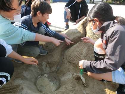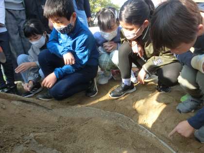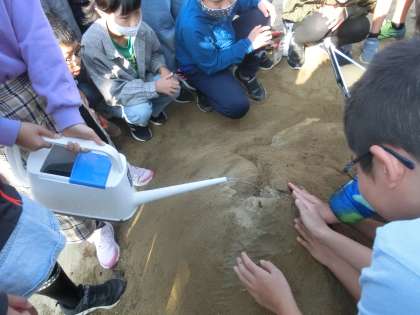 5年生の理科の授業です。砂場で、流れる水による地形の変化を調べていました。竹ボラさんが砂場をほぐしていただいたおかげで、実験がスムーズにできました。ありがとうございます。