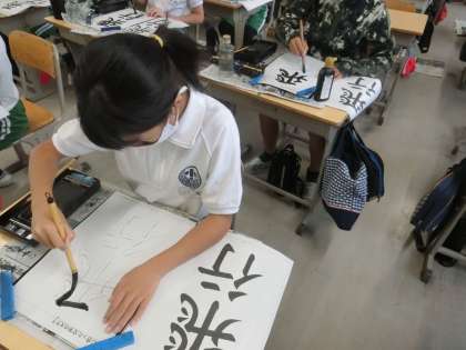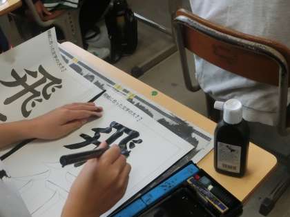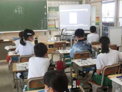 5年生の書写では、「飛行」の文字を練習していました。最初に「飛」という字の書き順を確認して、バランスの良い字が書けるように心がけています。