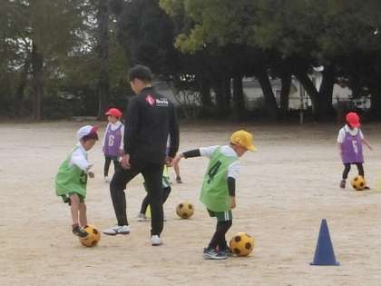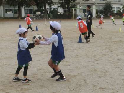 1年生と2年生が、「サッカー教室」を行いました。この活動は、運動することの楽しみを伝えるとともに心身の健全な発達に寄与することをねらいに行われています。