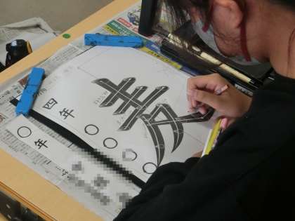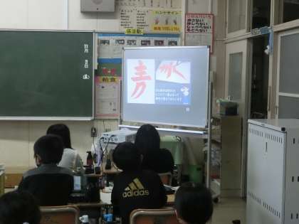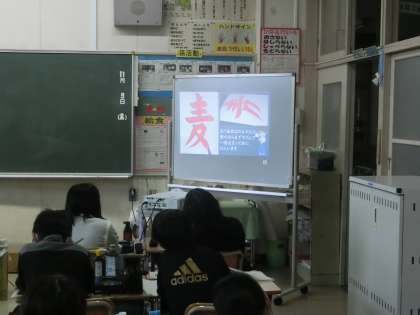 4年生の書写の授業です。「麦」という字の書き方を動画で確認しています。ポイントをお手本に記入している児童もいます。