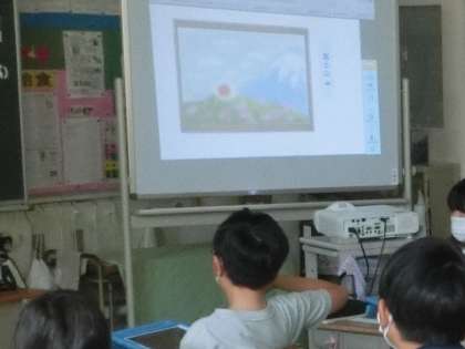4年生の図工で、学習用タブレットのアプリを使って富士山をかきました。スカイメニューの提出箱に提出されたみんなの作品を見ながら、いろいろな富士山を味わい、感性を磨きました。