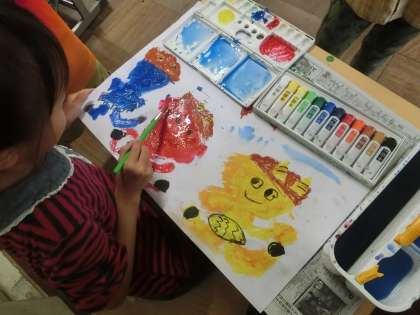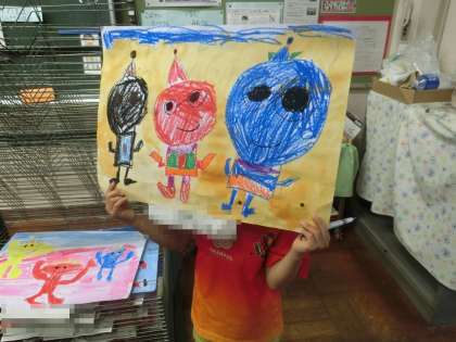 1年生が、図工の時間に読書感想画を描いています。物語は「おに の しょうがっこう」です。自分たちで考えた、いろいろなおにが描かれていました。
