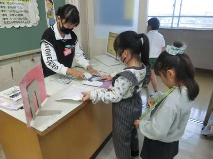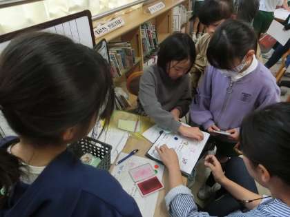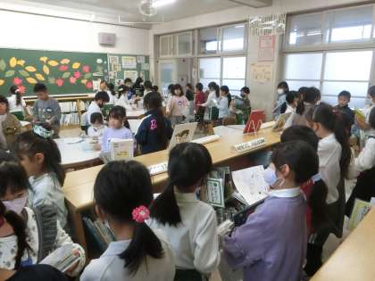 竹小タイムのなかよし図書館は、本を借りる児童でいっぱいでした。図書委員会が企画した読書まつりに多くの児童が参加しています。ビンゴカードのシールはりを手伝っている児童もいました。